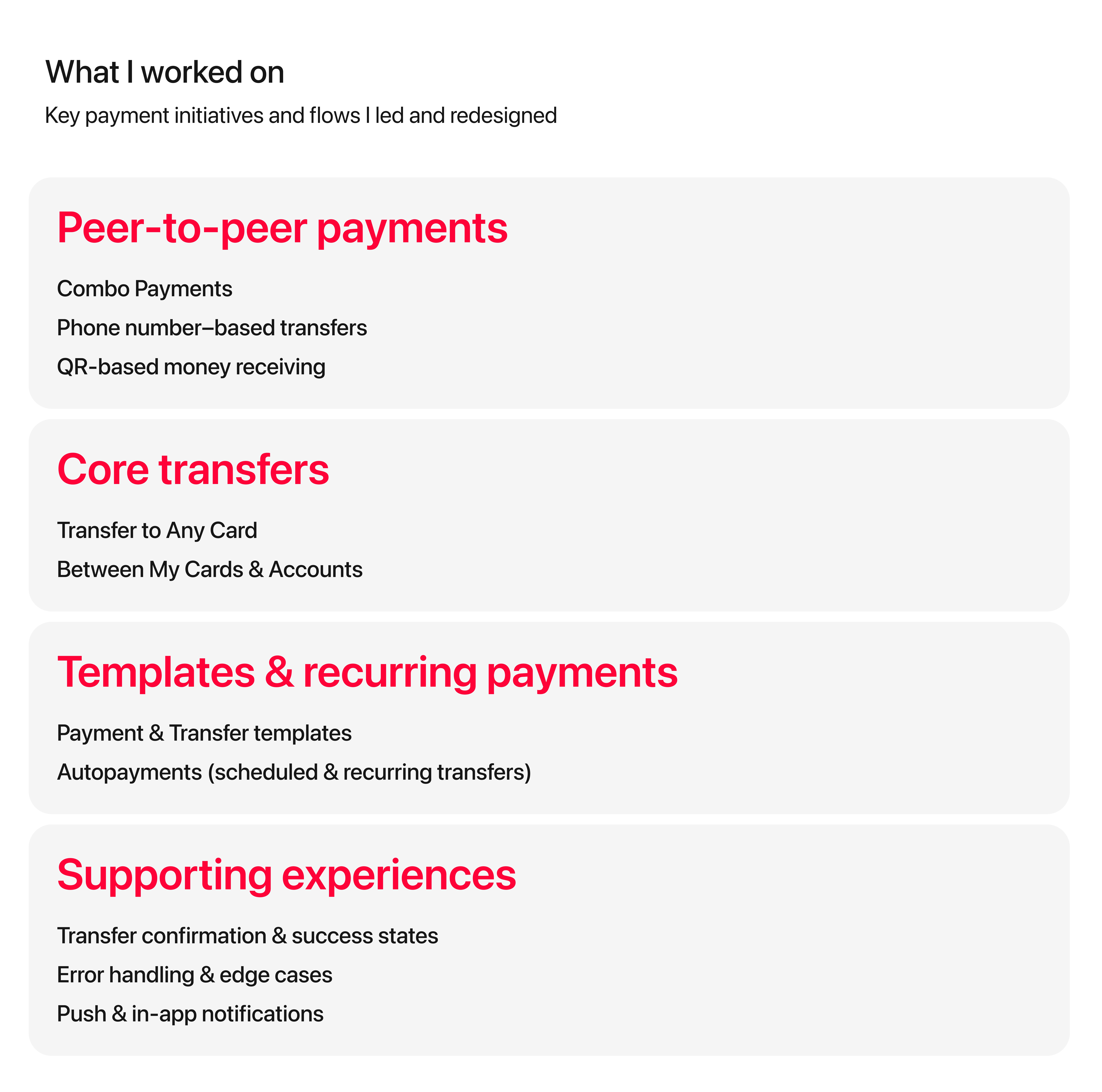 The work focused on reducing friction in repeat financial actions, improving visibility and control over payments, and designing scalable UX patterns that perform reliably under high user volume.