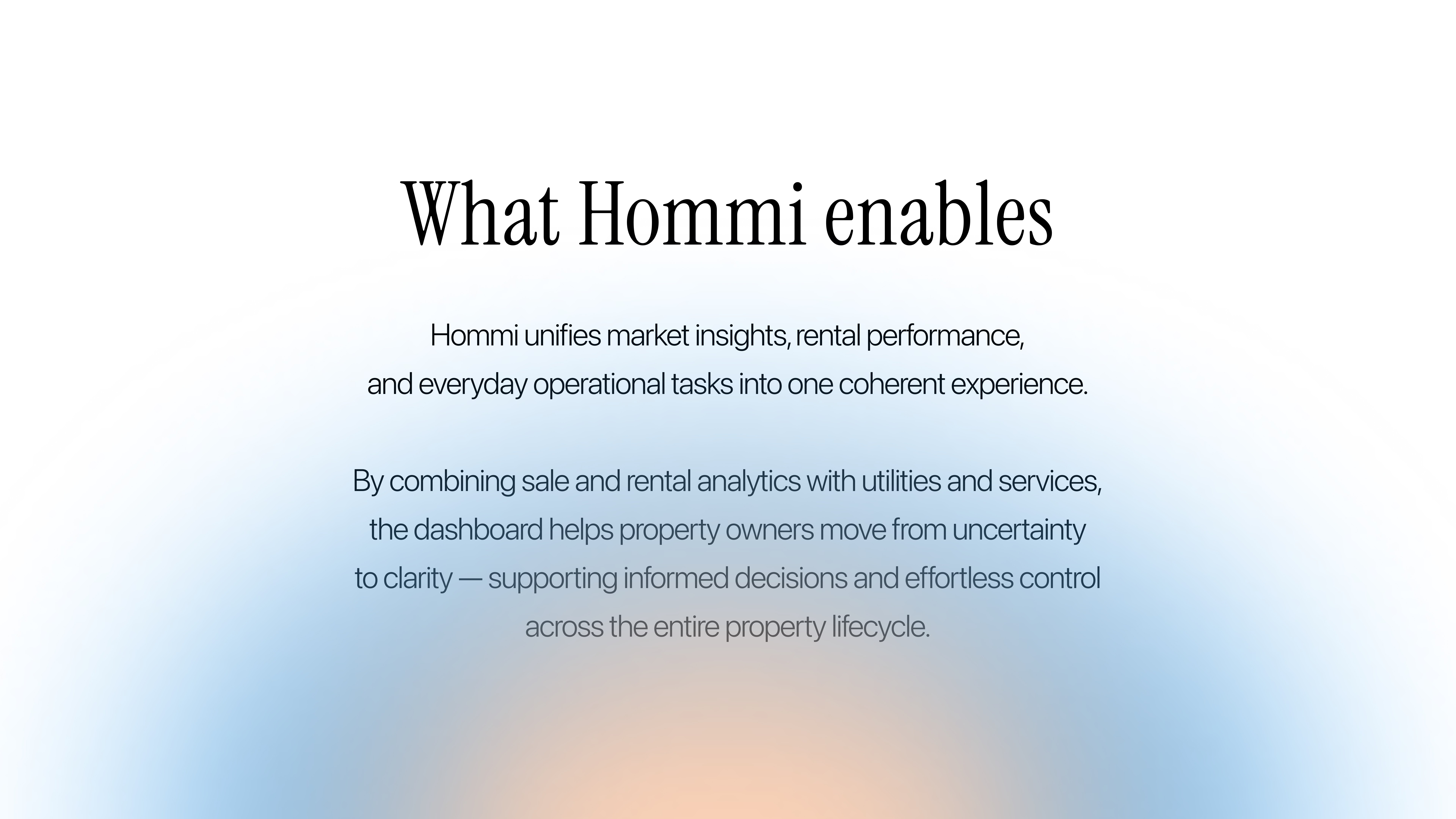 Hommi is a property management platform designed to help property owners manage value, income, and everyday operations from a single dashboard.